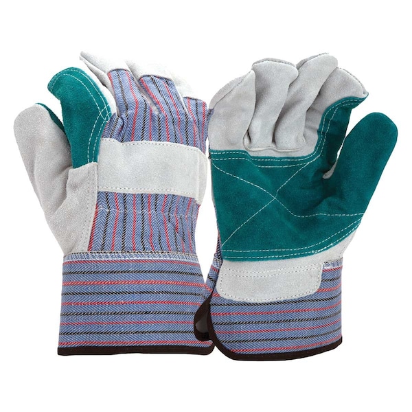 Leather Palm Gloves, Split Cowhide, Safety Cuff, Wing Thumb, Gray/Green, L, 1 PR