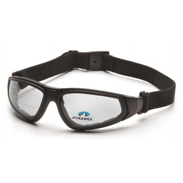 Pyramex Safety - XSG Reader - Black Frame/Clear Anti-Fog + 2.0 Lens - Flame resistant foam padding forms a seal to keep out dust and airborne particles. Strap has Quick Fit retainer for easy on/off. Lenses are treated to prevent fogging. Design allows air to flow freely reducing heat. XS EASE Replacement lens system. Interchangeable temples/strap included with each pair. Lenses provide 99% protection against harmful UV rays. Available in the following magnifying strengths. 1.5, 2.0, and 2.5