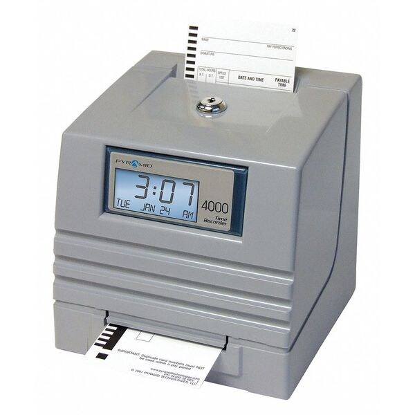 Digital, Mechanical, Display Type LCD, Mount Surface, Wall, No. of Employees 100, Time Clock, Depth 7 1/8 in, Ribbon Color Black, Display LCD, Standards UL Listed Power Supply, Records Date, Time, Hours Worked Between Punches, and Cumulative Hours, Includes Time Clock, 25 Time Cards, Keys, Ribbon and User Manual, Height 7 1/4 in, Width 7.125 in