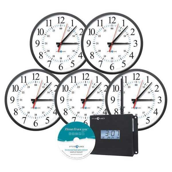 Five 13 in 12/24 Hour Face Rf Wireless Analog Wall Clocks, Five 3.6V Lithium Batteries, Software, Timetrax Sync(TM) Wall Mount Rf Wireless Transmitter, User Guide