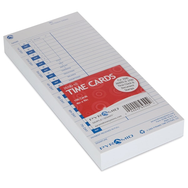 Track employee attendance easily with these time cards. Each card captures up to two in/out cycles per day for seven days, and specific data fields provide a detailed breakdown of various forms of compensation and pay deduction. This 100-pack of Pyramid universal time cards works with most side-loading time clocks.