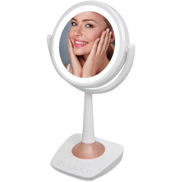 Whether you're putting makeup on or taking makeup off, the QFX R-72 5" Lighted Makeup Mirror with Bluetooth Speaker provides a convenient way to take care of your face. The natural and soft LED lights provide just the right amount of light for applying makeup or shaving. The 2 mirrors are distortion free, with 1 side providing 5 times magnification. The makeup mirror also has a built in Bluetooth speaker so you can stream music or answer calls while putting on makeup, and a USB port for charging up phones, tablets, etc. The anti-slip base means you can place it on a dresser, bathroom sink, a desk or any flat surface. This mirror speaker combo is ideal for use in the home, at work or while traveling.