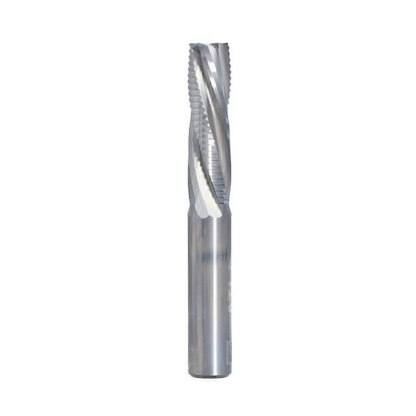 Four Flute Downcut Finishing Roughing router bits have two flutes with finishing edges and two flutes with serrated edges and are used when feed speed is required to be high or there is a lot of material to remove from the workpiece. The compression geometry allows for great finish on top and bottom of the material. The common applications are sizing, trimming and removing lots of material quickly. Increase the number of flutes if faster feedrate is required. Great for solid wood, veneered plywood and a variety of other materials. Used on 5 axis, point-to-point machines, router tables, handheld routers