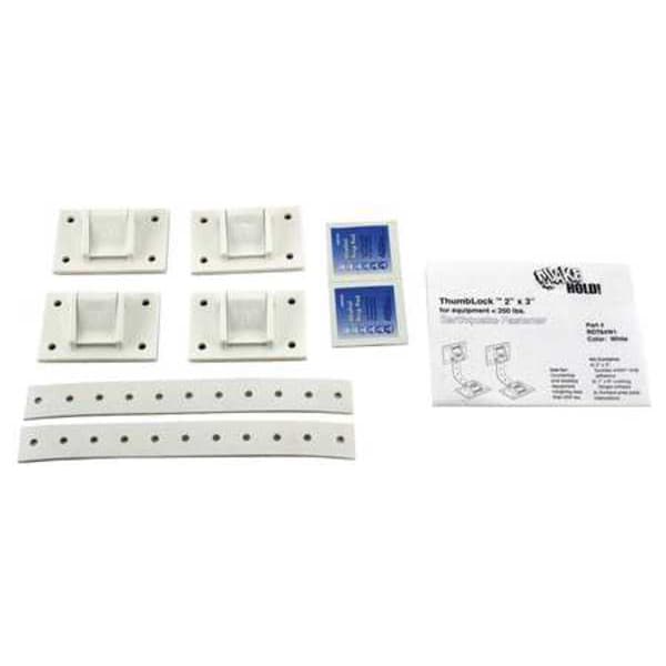 Equipment Fastener, White, Weight Capacity 200 lb, Used For Countertop And Desktop Equipment Weighing Less Than 200 Lbs., Includes (2) 1 in x 8 in Locking Straps with Holes, (2) Surface Prep Pads, (4) 2 in x 3 in Buckles with 3M(R) VHB Adhesive