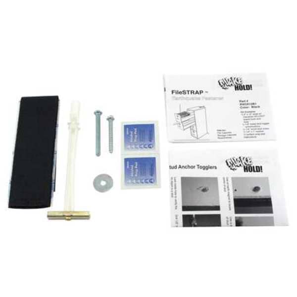 File Cabinet Fastener Strap, Black, Weight Capacity Not Applicable, Used For Secures File, Storage, And Similar Cabinets To Wall Studs With Industrial Hook And Loop, Avoids Penetrating Cabinet With Screws, Includes 1/4 in Metal Stud Screw, 1/4 in Metal Stud Toggler, 1/4 in Wood Stud Screw, 1/4 in x 1 in Washer, 2 in x 12 in Strap with Industrial Hook and Loop, Surface Prep Pad