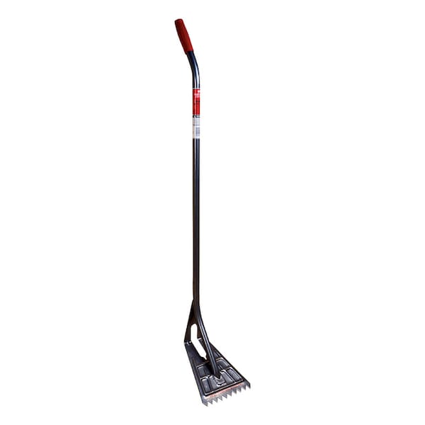 Our Classic Shingle Remover possesses an ergonomic design with vinyl grip handles, rugged steel construction, and a hot tempered work edge. This product is lightweight and versatile. This particular model of shingle remover is a general purpose shingle remover that pulls up to 16D nails with a fifty-four inch (54 in.) long steel handle with ten teeth.