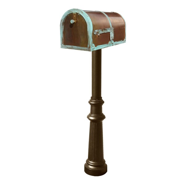 Rustic handcrafted old world charm comes to life in the Provincial Collection. These elegant (rural) post mount mailboxes are handcrafted one at a time from heavy gauge brass and copper in the old world tradition. Note the brass mailboxes have a lacquer finish to help protect them. To help preserve the polished finishes, we recommend a clear, no buff car wax. Clean the mailbox periodically with warm soapy water and a soft cloth, rinse and dry with a soft cloth. Then apply no buff car wax. Mailbox comes with the Hanford post system which is made of cast aluminum with a tough powder coated finish, mounting plate and decorative #8 fluted base in bronze color. . Provincial Collection Brass Mailbox in Antique Brass Patina with decorative Hanford Fluted base post in Bronze