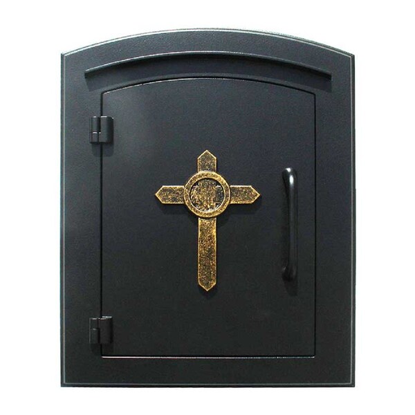 This decorative cast aluminum mailbox insert can be matched with an optional newspaper holder or address plaque. The doors have a tough powder coat finish, are sealed against the weather and it features a tough composite masonry box built to last. Oversized masonry box will hold up to seven days of mail. Mailbox can be easily inset into a column, pilaster or wall. (Faceplate dimensions: 11" x 14.5") (Masonry can dimensions: 16" x 8.5" x 12") . Manchester NON-LOCKING Column Mount Mailbox with "Decorative Cross Logo" in Black