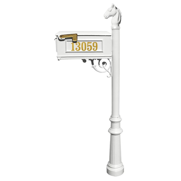Our Lewiston Equine Mailbox Collection is made from rust-free cast aluminum with a durable weather resistant finish. Mailbox comes with post, support brace, decorative horsehead finial and fluted base. Mailbox color is white and features either Black or Gold vinyl numbers that are attached to all three sides of mailbox . Post, support brace, finial and base color: White . Lewiston Equine Mailbox Post System with decorative fluted base, horsehead finial and Gold Vinyl personalized numbers