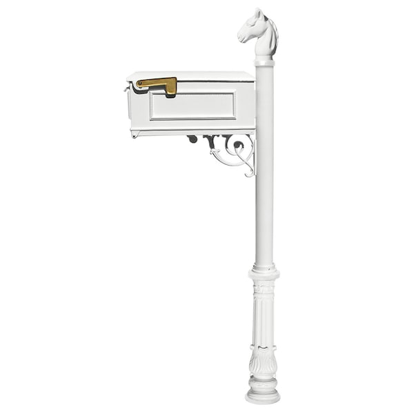 Our Lewiston Collection Equine mailbox (no address plates) is made from rust-free cast aluminum with a durable weather resistant finish and comes with post, decorative horsehead finial and ornate base. Color: White. Lewiston Equine Mailbox post system with ornate base and horsehead finial (no address plates or numbers)