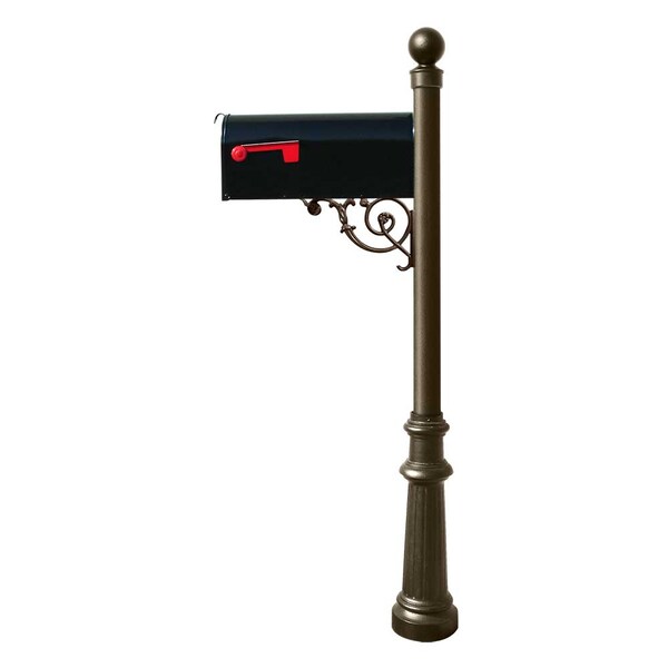 Our Lewiston Post is made from rust-free cast aluminum with a durable weather resistant finish and comes with a E1 Black Economy Mailbox, support brace with mounting plate, decorative ball finial and fluted base. E1 Economy mailbox is made of galvanized steel with a smooth rust-resistant finish, steel latch and red aluminum flag. Post, support brace, finial and base color: Bronze. . Lewiston post system with E1 Economy mailbox, mounting plate, fluted base and ball finial