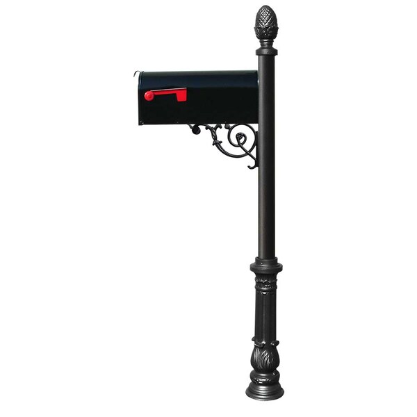 Our Lewiston Post is made from rust-free cast aluminum with a durable weather resistant finish and comes with a E1 Black Economy Mailbox, support brace with mounting plate, decorative pineapple finial and ornate base. E1 Economy mailbox is made of galvanized steel with a smooth rust-resistant finish, steel latch and red aluminum flag. Post, support brace, finial and base color: Black. . Lewiston post system with E1 Economy mailbox, mounting plate, ornate base and pineapple finial