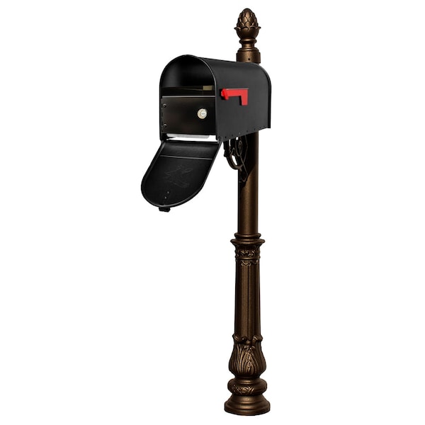Our Lewiston Post is made from rust-free cast aluminum with a durable weather resistant finish and comes with a E1 Black Economy Mailbox and Locking Insert, support brace with mounting plate, decorative pineapple finial and ornate base. E1 Economy mailbox is made of galvanized steel with a smooth rust-resistant finish, steel latch and red aluminum flag. Locking insert is made of galvanized steel and features a tough powder coat finish with locking front retrieval door keeping mail secure from unwanted hands. Incoming mail slot opening: W 6 3/8" x H 1". Locking door opening: H 5" x W 6 3/8". A lock and keys are included. Post, support brace, finial and base color: Bronze. . Lewiston post system with E1 Economy mailbox and E1 Locking Insert, mounting plate, ornate base and pineapple finial