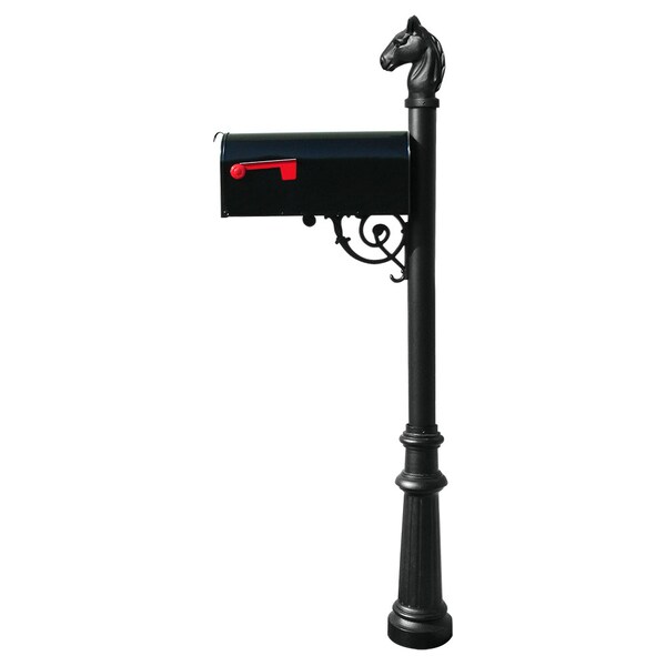 Our Lewiston Equine Post is made from rust-free cast aluminum with a durable weather resistant finish and comes with a E1 Black Economy Mailbox, support brace with mounting plate, decorative horsehead finial and fluted base. E1 Economy mailbox is made of galvanized steel with a smooth rust-resistant finish, steel latch and red aluminum flag. Post, support brace, finial and base color: Black. . Lewiston Equine post system with E1 Economy mailbox, mounting plate, fluted base and horsehead finial