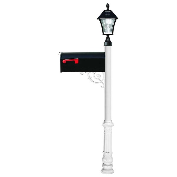 Lewiston Post / Economy #1 Mailbox comes with support brace and ornate base in white color. Black Economy #1 Mailbox is made of galvanized metal with smooth finish, steel latch and red aluminum flag. Post, support brace and ornate base are made of rust-free cast aluminum with a weather resistant finish. The Bayview Solar Lamp mounts to the top of the post and features a classic gas-light design with real beveled glass panes. With our super-bright LED's and patented cone reflector technology, guests will easily spot your address at night. Using efficient solar-powered technology, the Bayview charges by day and automatically turns on at night. No wiring is needed. And with a weather-resistant powder-coated cast aluminum frame, no maintenance is required. (Solar lamp available in color black only) . Lewiston post w/ economy #1 mailbox, ornate base in white color with black solar lamp