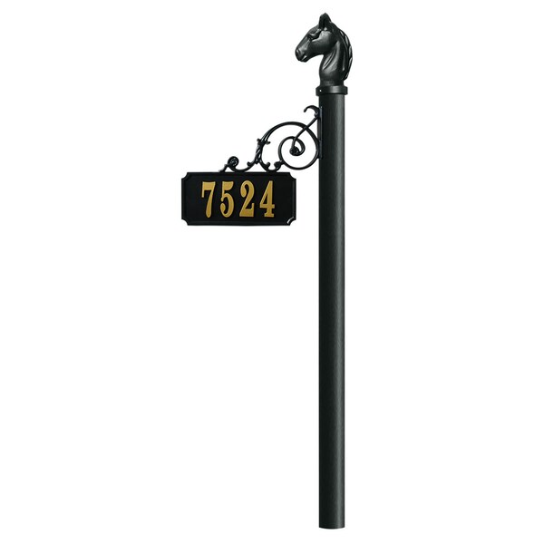 Our Equestrian Collection is made of durable, rust-free aluminum with weather resistant powder coat finish to last a lifetime. The scroll mount address post comes with scroll address plate (NO BASE) and Horsehead finial. Gold 4" Vinyl personalized numbers included. White reflective 4" numbers also available.. Scroll Mount Address Post (NO BASE) with Horsehead finial