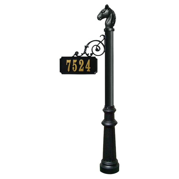 Our Equestrian Collection is made of durable, rust-free aluminum with weather resistant powder coat finish to last a lifetime. The scroll mount address post comes with scroll address plate, decorative Fluted base and Horsehead finial. Gold 4" Vinyl personalized numbers included. White reflective 4" numbers also available. . Scroll Mount Address Post with decorative Fluted base and Horsehead finial
