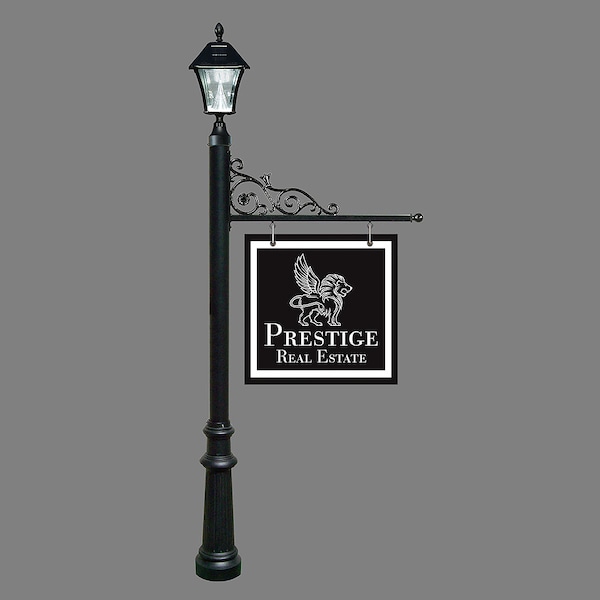 Give your premium listings a mark of distinction with our Prestige Real Estate Sign System. The quality of our Prestige cast aluminum sign posts will elevate your signage above competing wood and vinyl alternatives. Our posts feature a durable, low maintenance black powder coat finish that will look great for years to come. Sign system comes with decorative fluted base, bayview solar lamp and scroll arm ready for your hanging sign. Post mounts directly into ground or a ground-mounting spike is also available and sold separately. System color: Black. (Length of scroll arm: 34" ) (Distance between post and first hole: 8") (Distance between holes on scroll arm: 16") (Hanging sign not provided) The Bayview Solar Lamp mounts to the top of the post and features a classic gas-light design with real beveled glass panes. With our super-bright LED's and patented cone reflector technology, guests will easily spot your Real Estate Sign at night. Using efficient solar-powered technology, the Bayview charges by day and automatically turns on at night. No wiring is needed. And with a weather-resistant powder-coated cast aluminum frame, no maintenance is required. (Solar lamp available in color black only) . Prestige Real Estate Sign System with Bayview Solar Lamp & Fluted Base in Black color