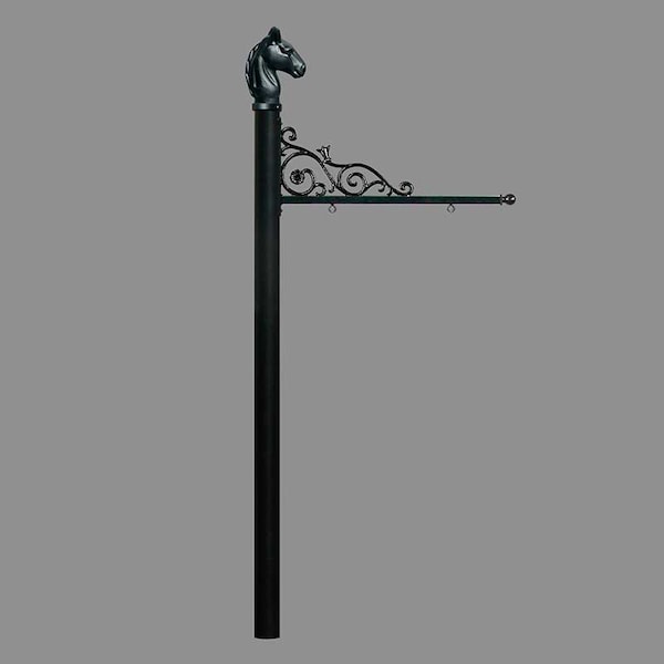 Give your premium listings a mark of distinction with our Prestige Real Estate Sign System. The quality of our Prestige cast aluminum sign posts will elevate your signage above competing wood and vinyl alternatives. Our posts feature a durable, low maintenance black powder coat finish that will look great for years to come. Sign system comes with decorative horsehead finial and scroll arm ready for your hanging sign. Post mounts directly into ground or a ground-mounting spike is also available and sold separately. System color Black. (Length of scroll arm: 34" ) (Distance between post and first hole: 8") (Distance between holes on scroll arm: 16") (Hanging sign not provided) . Prestige Real Estate Sign System with Horsehead Finial, NO BASE in Black color