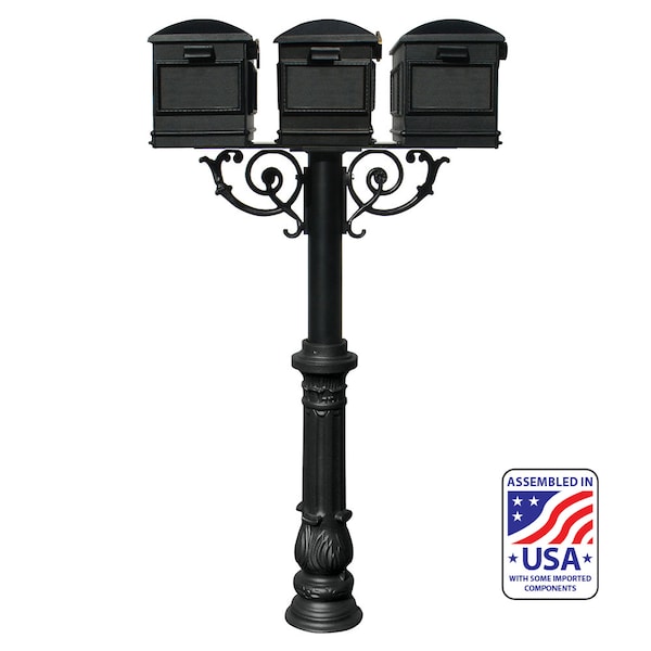 Our Hanford mailbox post system is made from rust-free cast aluminum with a durable weather resistant powder coated finish. This TRIPLE post comes with support braces, a decorative Ornate base 7, three Lewiston mailboxes and mounting plate at top of post. The Lewiston mailboxes are made of cast aluminum and also features a tough powder coat finish. Post, support braces, mailboxes, mounting plate and base color: Black. . The Hanford TRIPLE mailbox post system w/Scroll Supports