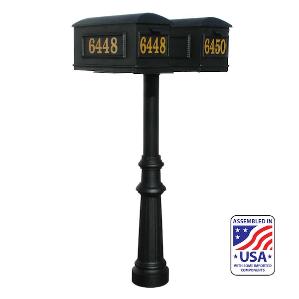 Our Hanford mailbox post system is made from rust-free cast aluminum with a durable weather resistant powder coated finish. This TWIN post (no support braces) comes with a decorative Fluted base 8, two Lewiston mailboxes and mounting plate at top of post. The Lewiston mailboxes are made of cast aluminum and also features a tough powder coat finish. Post, mailboxes, mounting plate and base color: Black. . The Hanford TWIN (no scrolls) mailbox post system