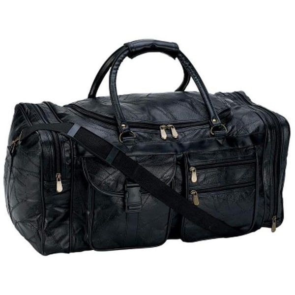 Made of genuine cowhide leather. Color: Black. Multiple pockets. Heavy-duty comfort grip handles. Adjustable/detachable shoulder strap. Measures: 25" x 12" x 12".