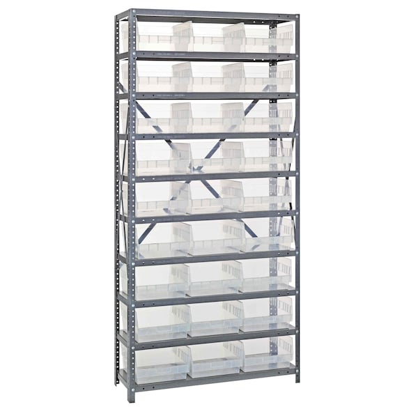 Shelving Unit, 18''D x 36''L x 75''H, heavy duty, 400 lb. load capacity per shelf, includes: 13 shelves, 27 17-7/8''L x 11-1/8''W x 4''H QSB210 clear black bins, uprights and cross bars, smooth powder-coat finish