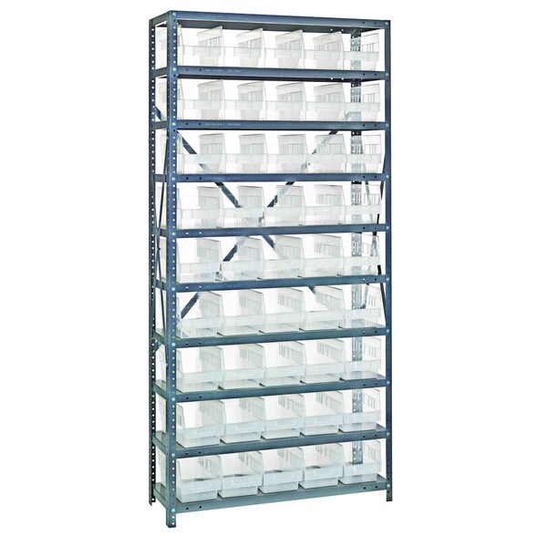 Shelving Unit, 12''D x 36''L x 75''H, heavy duty, 400 lb. load capacity per shelf, includes: 10 shelves, 45 11-5/8''L x 6-5/8''W x 6''H QSB202 clear black bins, uprights and cross bars, smooth powder-coat finish