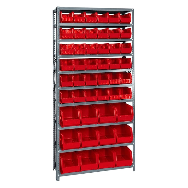 Shelving Unit, 12''D x 36''L x 75''H, heavy duty, 400 lb. load capacity per shelf, includes: 10 shelves, 36 QUS230 and 12 QUS240 red bins, uprights and cross bars, smooth powder coat finish