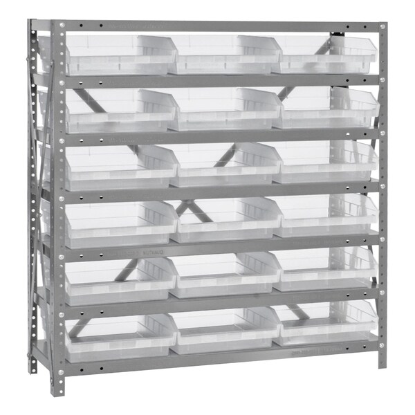 Shelving Unit, 12''D x 36''L x 39''H, heavy duty, 400 lb. load capacity per shelf, includes: 7 shelves, 18 11-5/8''L x 11-1/8''W x 4''H QSB109 clear bins, uprights and cross bars, smooth powder-coat finish