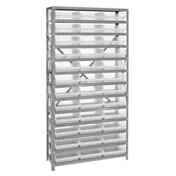 Shelving Unit, 12''D x 36''L x 75''H, heavy duty, 400 lb. load capacity per shelf, includes: 13 shelves, 36 11-5/8''L x 11-1/8''W x 4''H QSB109 clear black bins, uprights and cross bars, smooth powder-coat finish