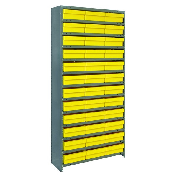 Shelving Unit, closed, 12''D x 36''L x 39''H , heavy duty, 400 lb. load capacity per shelf, includes: 13 shelves, 24 11-7/8''L x 5-9/16''W x 4-5/8''H QED601, 16 11-5/8''L x 8-3/8''W x 4-5/8''H QED701 and 12 11-5/8''L x 11-1/8''W x 4/5/8''H QED801 yellow bins, uprights and cross bars, smooth powder-coat finish