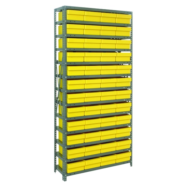 Shelving Unit, 12''D x 36''L x 75''H, heavy duty, 400 lb. load capacity per shelf, includes: 13 shelves, 48 11-5/8''L x 8-3/8''W x 4-5/8''H QED701 yellow black bins, uprights and cross bars, smooth powder-coat finish