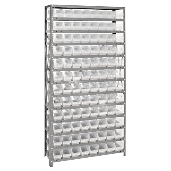 Shelving Unit, 18''D x 36''L x 75''H, heavy duty, 400 lb. load capacity per shelf, includes: 13 shelves, 96 17-7/8''L x 4-1/8''W x 4''H QSB103 clear black bins, uprights and cross bars, smooth powder-coat finish
