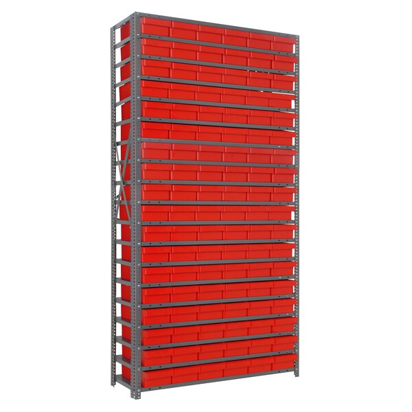 Shelving Unit, 12''D x 36''L x 75''H, heavy duty, 400 lb. load capacity per shelf, includes: 19 shelves, 27 11-5/8''L x 5-9/16''W x 2-1/8''H QED401 red black bins, uprights and cross bars, smooth powder-coat finish