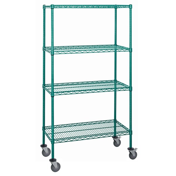 Mobile Cart, 36''W x 18''D x 69''H, 1200 lbs. load capacity, includes: 4 shelves, 4 posts, 1 inlay mat, 3 label holders, 4 donut bumpers and 4 5'' polyurethane swivel casters 2 with brakes, green epoxy antimicrobial finish, NSF