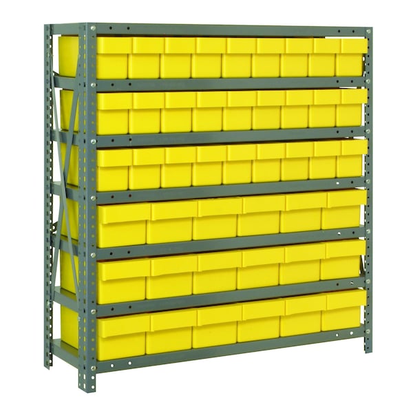 Shelving Unit, 18''D x 36''L x 39''H, heavy duty, 400 lb. load capacity per shelf, includes: 7 shelves, 27 17-7/8''L x 3-3/4''W x 4-5/8''H QED604 and 18 17-7/8''L x 5-9/16''W x 4-5/8''H QED602 yellow black bins, uprights and cross bars, smooth powder-coat finish