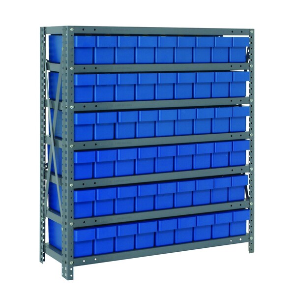Shelving Unit, 18''D x 36''L x 39''H, heavy duty, 400 lb. load capacity per shelf, includes: 7 shelves, 54 17-7/8''L x 3-3/4''W x 4-5/8''H QED604 blue black bins, uprights and cross bars, smooth powder-coat finish