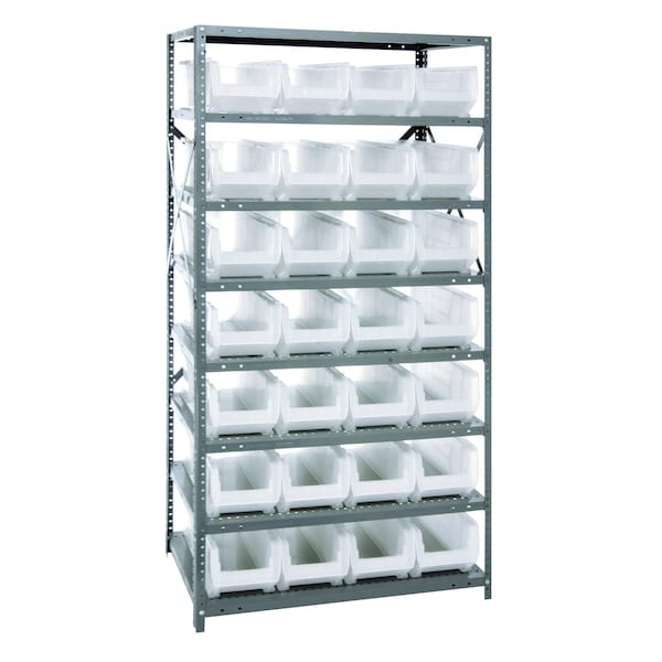 Shelving Unit, 24''D x 36''L x 75''H, heavy duty, 400 lb. load capacity per shelf, includes: 8 shelves, 28 23-7/8''L x 8-1/4''W x 7''H QUS950 clear black bins, uprights and cross bars, smooth powder-coat finish