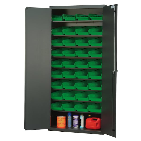 Heavy-Duty 36'' Bin Cabinet, 36''W x 18''D x 78''H, 400 lb. capacity per shelf, 14 gauge all welded construction, includes: 8 slopped shelves and 36 QSB103 green bins, beige powder-coated finish