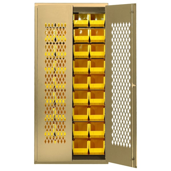Specialty Bin Cabinets, heavy-duty, mesh door model, 36''W x 18''D x 78''H, Includes: 36 14-3/4''L x 8-1/4''W x 7''H QUS240 yellow bin, 14-gauge all welded construction, beige finish, ships assembeled