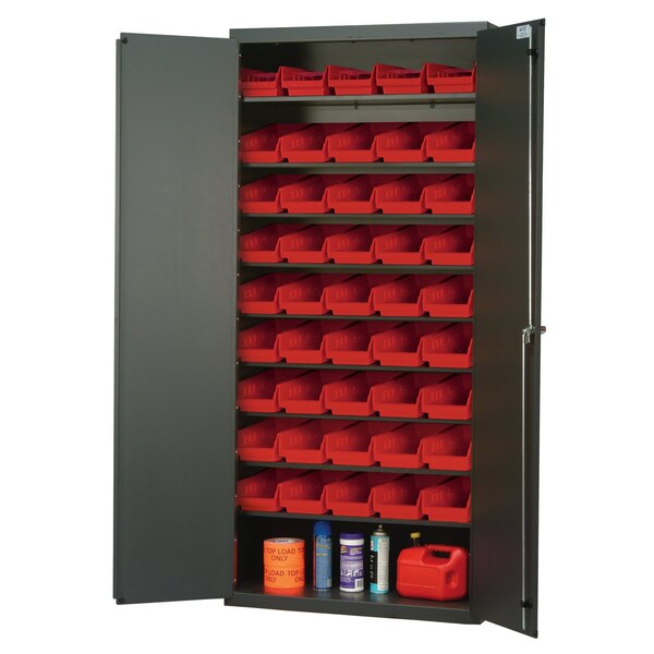 Heavy-Duty 36'' Bin Cabinet, 36''W x 18''D x 78''H, 400 lb. capacity per shelf, 14 gauge all welded construction, includes: 8 slopped shelves and 45 QSB102 red bins, beige powder-coated finish