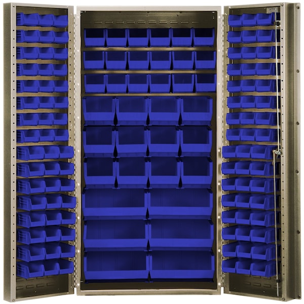 Heavy-Duty 36'' Bin Cabinet, 36''W x 24''D x 72''H, 14 gauge all welded construction, includes: 48 QUS210, 48 QUS220, 18 QUS230, 12 QUS240 and 6 QUS250 blue bins, beige powder-coated finish