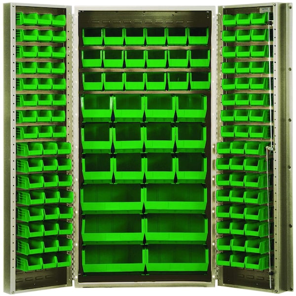 Heavy-Duty 36'' Bin Cabinet, 36''W x 24''D x 72''H, 14 gauge all welded construction, includes: 48 QUS210, 48 QUS220, 18 QUS230, 12 QUS240 and 6 QUS250 green bins, beige powder-coated finish