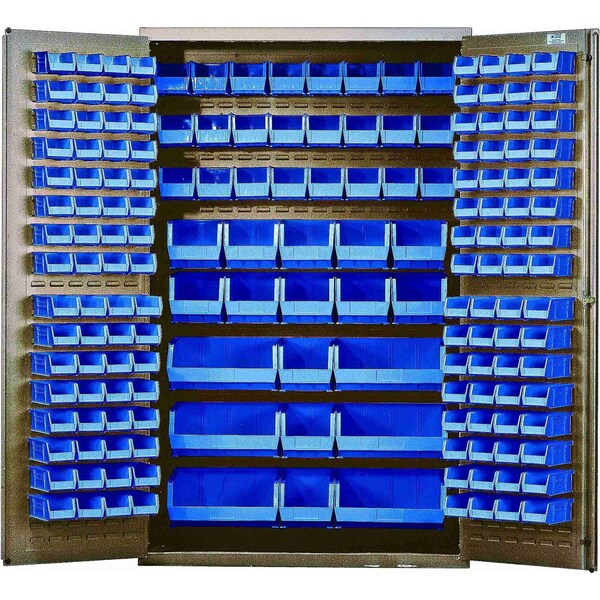 Heavy-Duty 48'' Bin Cabinet, 48''W x 24''D x 78''H, 14 gauge all welded construction, includes: 64 QUS210, 64 QUS220, 24 QUS230, 13 QUS240 and 6 QUS250 blue bins, beige powder-coated finish