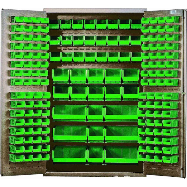 Heavy-Duty 48'' Bin Cabinet, 48''W x 24''D x 78''H, 14 gauge all welded construction, includes: 64 QUS210, 64 QUS220, 24 QUS230, 13 QUS240 and 6 QUS250 green bins, beige powder-coated finish