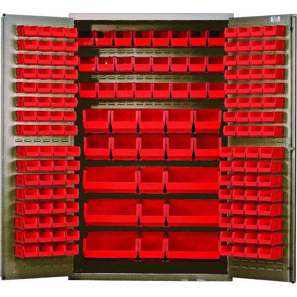 Heavy-Duty 48'' Bin Cabinet, 48''W x 24''D x 78''H, 14 gauge all welded construction, includes: 64 QUS210, 64 QUS220, 24 QUS230, 13 QUS240 and 6 QUS250 red bins, beige powder-coated finish