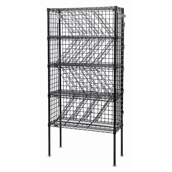 Bulk Wine Shelving Unit, 36''W x 14''D x 74''H, holds up to 12 cases, includes: 5 flat shelves, 4 74'' posts, 4 foot plates, 12 18'' slanted wine dividers, 4 35'' bottle support, 1 14'' side enclosure panlel, 1 36'' back enclosure panel, and 2 wall brackets, black epoxy antimicrobial finish, NSF