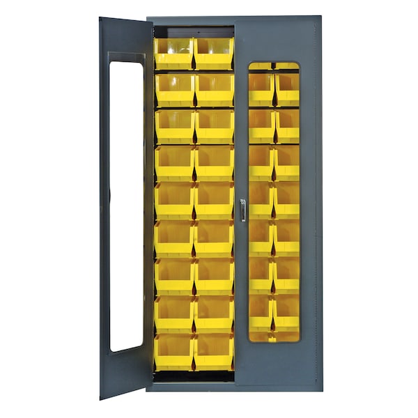The Security Bin Cabinet is a clear door model that allows for high visibility of its contents. Is gray in color, comes preassembled and ready for use, ideal for the storage of industrial parts and supplies, comes with a total 36 QUS240 bins, available in color: blue, red, yellow, green, ivory, black and clear, measures 36" wide for increased storage capacity.