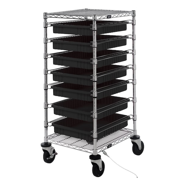 Bin Cart, mobile, conductive, 21''W x 24''L x 45''H, includes: 2 wire shelves, 7 22-1/2''L x 17-1/2''W x 3''H DG93030 black bin and set of casters, chrome plated finish